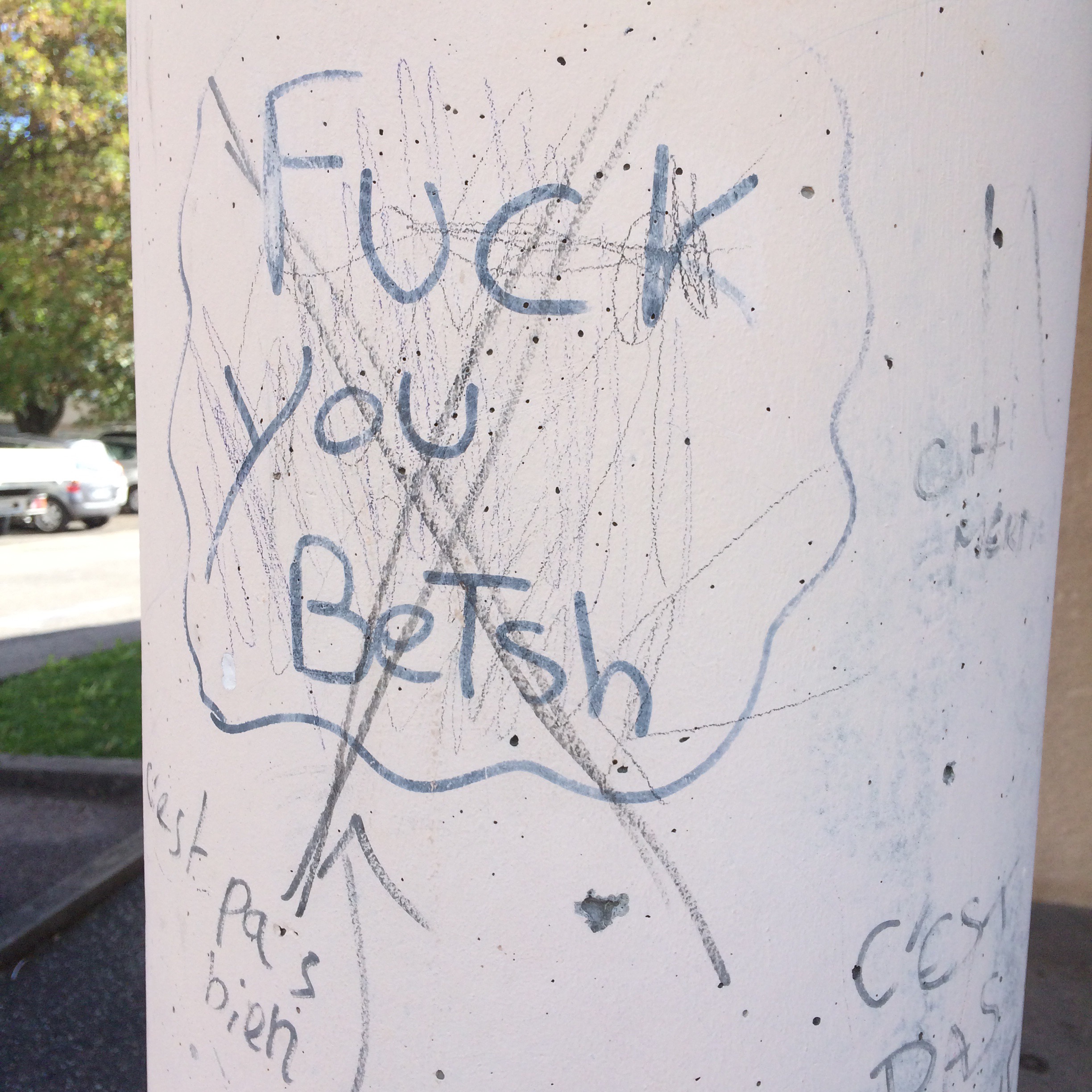 October 12, 2015 Graffiti Fail Playground graffiti French phonetic spelling class Not the lesson plan (This is at our school, by the ashtray.) Share this: Click to share on X (Opens in new window) X Click to share on Facebook (Opens in new window) Facebook Like Loading... Related