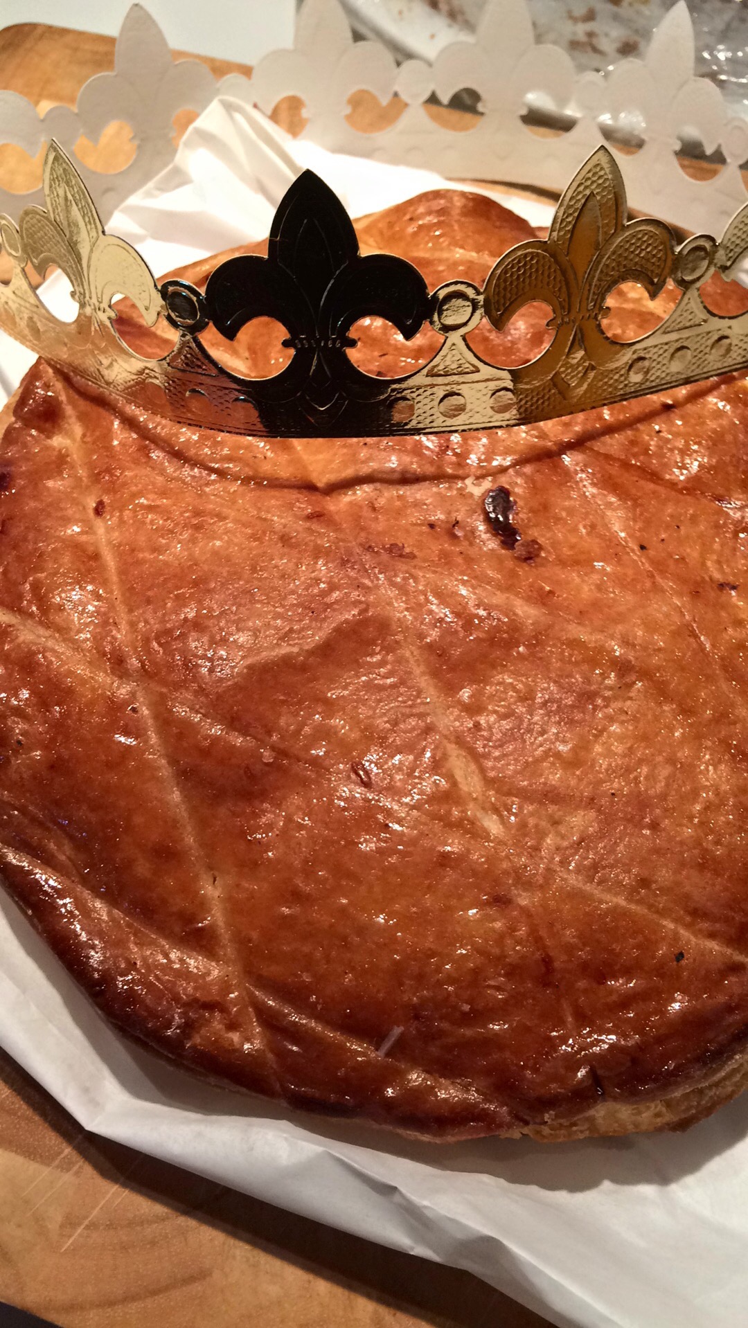 There is a similar tradition in the southern U.S., also called a King Cake, during Mardi Gras. This cake is more like the round galette and a baby trinket is hidden inside.